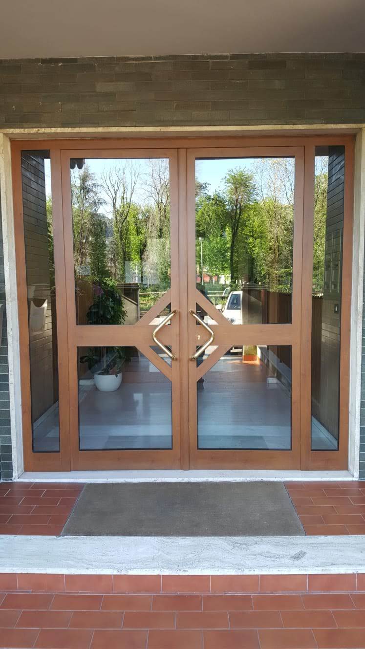 Accesso condominiale a due ante, finitura effetto legno ed ellettromagnete OPERA con cilindro
